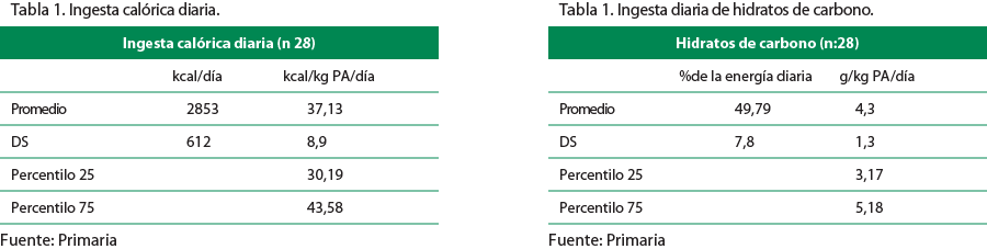 • Ingesta calórica diaria: Por medio de un registro de 4 días se obtuvo una muestra de los alimentos/bebidas ingeridos/as habitualmente. Posteriormente se procedió a realizar un promedio diario de las kcal y de los nutrientes. Para el análisis, se utilizó la tabla de composición química de la Universidad de Luján.(2) Por medio del procedimiento citado anteriormente se obtuvieron las calorías diarias consumidas, siendo el mismo expresado de dos formas:
