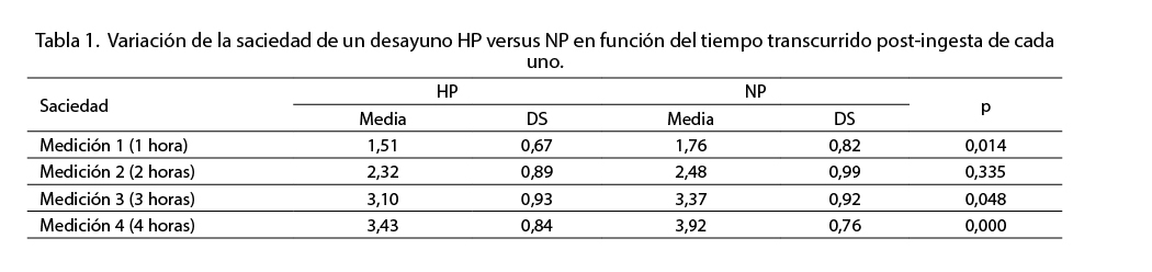 La saciedad del desayuno HP fue significativamente mayor respecto al NP, contribuyendo a controlar el apetito en las próximas cuatro horas de ingerido.