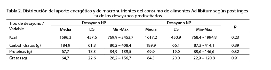A lo largo del día, no pudo observarse su efectividad dado que, independientemente del tipo de desayuno, el consumo prospectivo de alimentos Ad libitum fue similar, no influyendo el desayuno, sobre la ingesta energética total ni en el aporte de macronutrientes diarios.