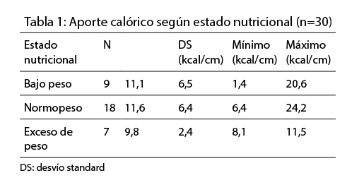 En los niños con bajo peso (n=10), el promedio fue de 11,1 kcal/cm, con un valor mínimo de 1,4 kcal/cm y un valor máximo de 20,6 kcal/cm. Se encontró un aporte similar entre los niños con seguimiento nutricional (n=7; 13,1 kcal/cm) y sin el mismo (n=3; 12,4 kcal/cm). En el caso de los niños con normopeso, el promedio fue de 11,6 kcal/cm (DS ±6,4 kcal/cm; valor mínimo 6,4 kcal/cm, valor máximo 24,2 kcal/cm), sin presentar diferencias significativas con el grupo de bajo peso (p=0,13). La similitud hallada en la mediana y la amplitud de los valores extremos podrían deberse a un requerimiento calórico distinto debido al tipo de PC, alguna patología asociada, la medicación utilizada, antecedente de bajo peso en recuperación nutricional o exceso de peso en plan de descenso. En los niños con exceso de peso, el valor promedio fue de 9,8 kcal/cm (±2,4 kcal/cm; valor mínimo 8,1 kcal/cm, valor máximo 11,5 kcal/cm). En este grupo el aporte calórico promedio resultó menor que el de los grupos con normo y bajo peso, sin llegar a ser estadísticamente significativo, y levemente por debajo a lo establecido por Culley et al. Nuevamente esto podría deberse a una intervención nutricional que busque lograr un peso más saludable y que permita una manipulación más sencilla del niño o, podría ser producto de un factor clínico que hace que en esos niños su requerimiento energético sea menor.