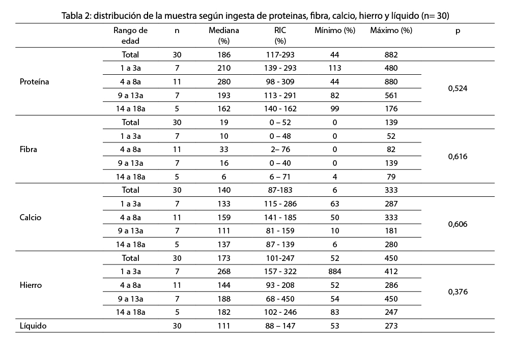 Al igual que lo descrito por Kilpinen L (26), la fibra reflejó el peor patrón de consumo, ya que el 97% de la muestra (n= 29) no cubrió su requerimiento. El porcentaje de adecuación de consumo de la muestra presentó una mediana de 19% (RIC: 0 – 52%; valor mínimo 0%, valor máximo 139%). Este porcentaje puede deberse a que la mayoría de la muestra utilizaba fórmulas infantiles sin fibra y/o leche de vaca. Cabe destacar que, si bien el aporte de fibra de los niños que consumían un tipo de alimentación mixta o con alimentos modificados fue mayor, tampoco cubrieron el requerimiento. El valor máximo representaba al único niño que cubrió dicho aporte a partir de una fórmula polimérica con fibra.