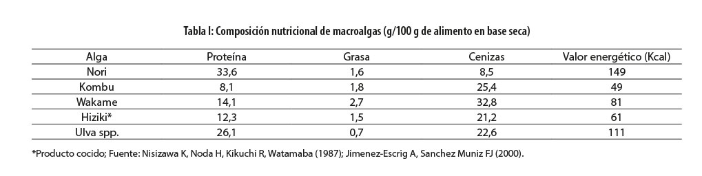 Las algas son un recurso abundante, económico y atractivo para utilizar como ingrediente en alimentos. Su composición depende no sólo del género y la especie, sino también de la porción de la planta, el estado de crecimiento y de factores geográficos, estacionales y climáticos (1). Son organismos que viven en un hábitat complejo y que se encuentran en condiciones extremas (cambios de salinidad, temperatura, variación en la irradiación, periodos de emersión por efecto de las mareas, oleajes y predadores), por lo que deben adaptarse rápidamente a las nuevas condiciones ambientales para sobrevivir, produciendo para ello una gran variedad de metabolitos secundarios biológicamente activos, con biomoléculas únicas no encontradas en otros organismos (8).