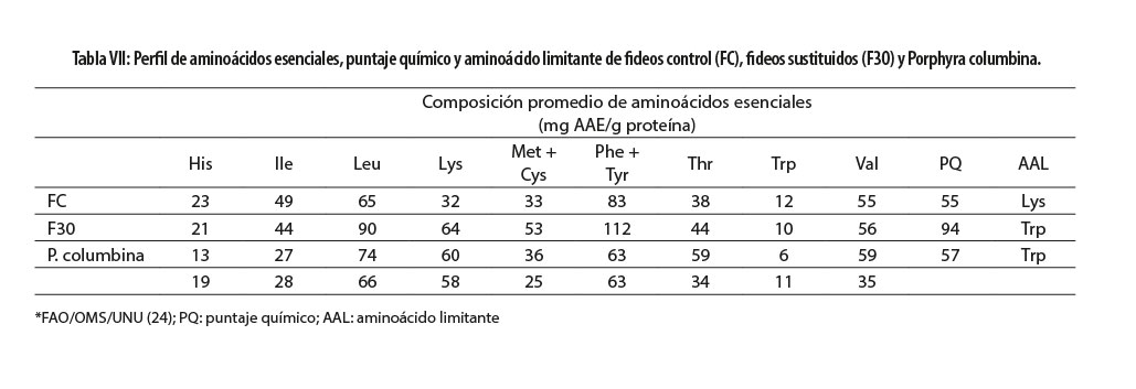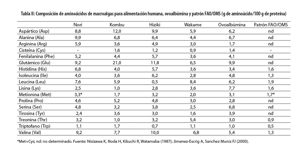 En las Tablas I y II se puede observar el contenido proteico y el perfil de aminoácidos de las principales algas utilizadas como alimentos (10, 17). Todas ellas, especialmente los productos Hiziki, tienen un elevado contenido de valina e isoleucina, mientras que leucina es más abundante en Wakame y Nori. El contenido de fenilalanina y treonina fue alto en Hiziki y Wakame como se observa en la Tabla II. Al comparar el patrón de aminoácidos esenciales descripto por FAO/OMS (18) para alimentación humana con el perfil de aminoácidos de las algas, puede observarse que los aminoácidos limitantes en las algas fueron cisteína, histidina, lisina, metionina y triptofano, además de treonina en el caso de Kombu. Respecto al contenido en aminoácidos no esenciales, Kombu e Hiziki presentaron alto contenido de glutámico, mientras que Nori presentó el mayor aporte de arginina.