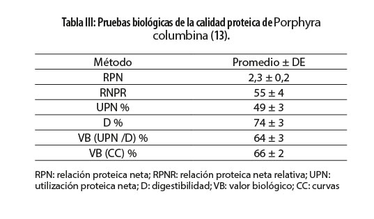 Entre las algas rojas comestibles, Porphyra columbina es una de las más importantes de la Patagonia Argentina. Estudios actuales sobre el reconocimiento de las macroalgas marinas patagónicas mencionan el cambio de nombre de Porphyra columbina a Pyropia columbina (15). Es de sabor agradable, arrepollada en su estadio juvenil, semejando más tarde a pañuelos de color pardo, violeta o dorado (13). En estudios previos de composición centesimal del alga seca correspondiente a su estadio de mayor concentración de nutrientes (fin del invierno, principio de la primavera) durante tres años consecutivos, se indicó 31,0 g% de proteína, 0,3 g% de grasa, 8,6 g% de cenizas,