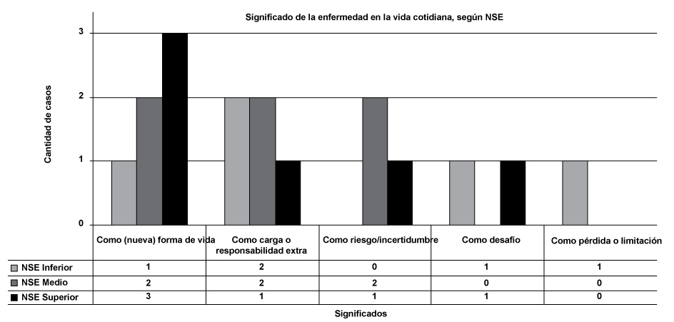 El criterio de saturación se logró con 12 sujetos entrevistados (4 de cada NSE, 50% varones y 50% mujeres). Así, para la categoría “Significado de la enfermedad en la vida cotidiana”, se construyeron 5 dimensiones diferenciadas. Las dos primeras implicaron una conceptualización más positiva mientras que las tres restantes, negativas. A continuación se presenta una definición de las dimensiones con algunos relatos de los sujetos.