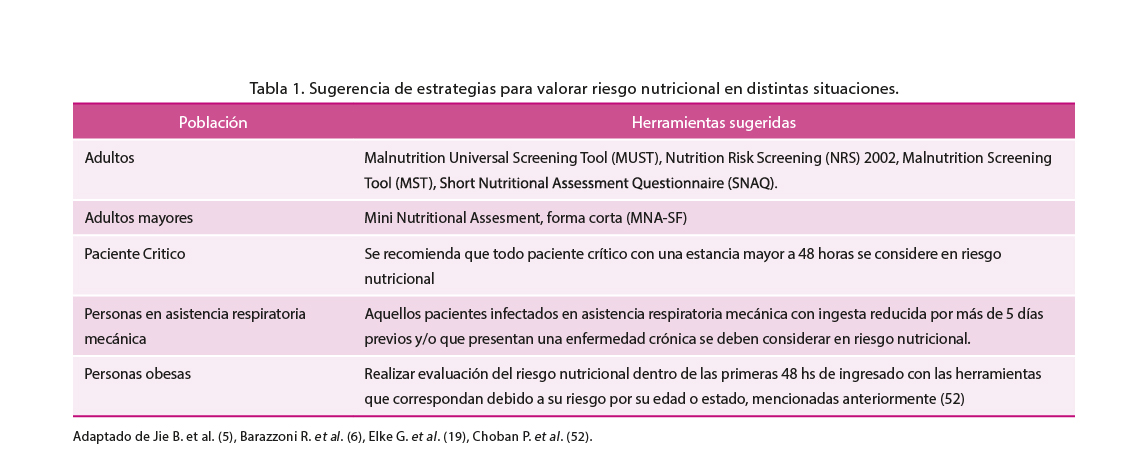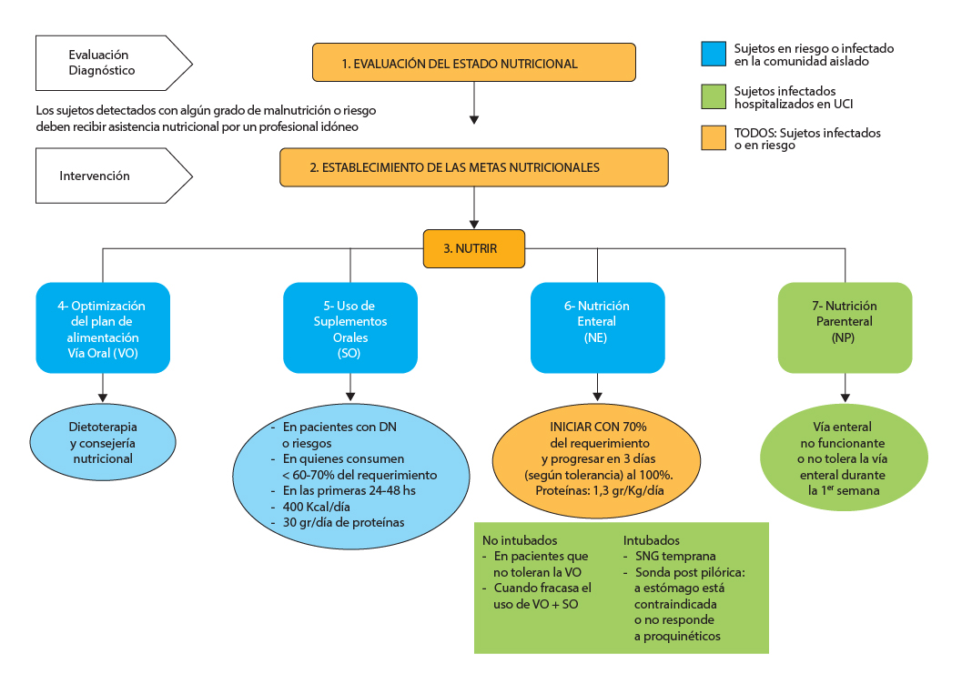 Una nueva enfermedad pone en discusión y revisión los protocolos de intervención nutricional que se realizan en las distintas instituciones dando oportunidad a mejorarlos no solo para la atención de las personas que sufren Covid-19 sino para todas las personas internadas. Se necesitarán muchos estudios de investigación para conocer la forma de valorar el estado nutricional de los pacientes infectados con SARS-CoV2 y el tratamiento nutricional óptimo y específico para las distintas formas de presentación de la infección. Actualmente, no hay duda de que el tratamiento nutricional debe ir acompañado y ser parte integral del tratamiento global del paciente..