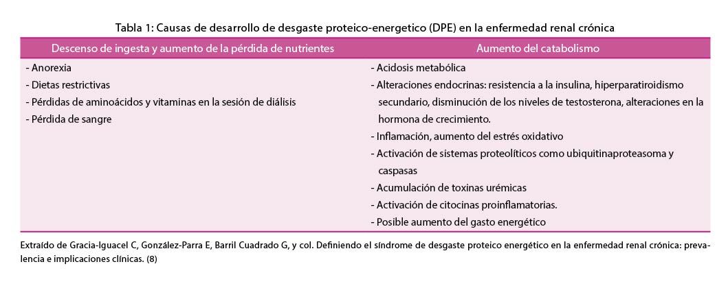 Gracia-Iguacel C, González-Parra E, Barril Cuadrado G, y col. Definiendo el síndrome de desgaste proteico energético en la enfermedad renal crónica: prevalencia e implicaciones clínicas. Nefrología 2014; 34 (4): 425-544.