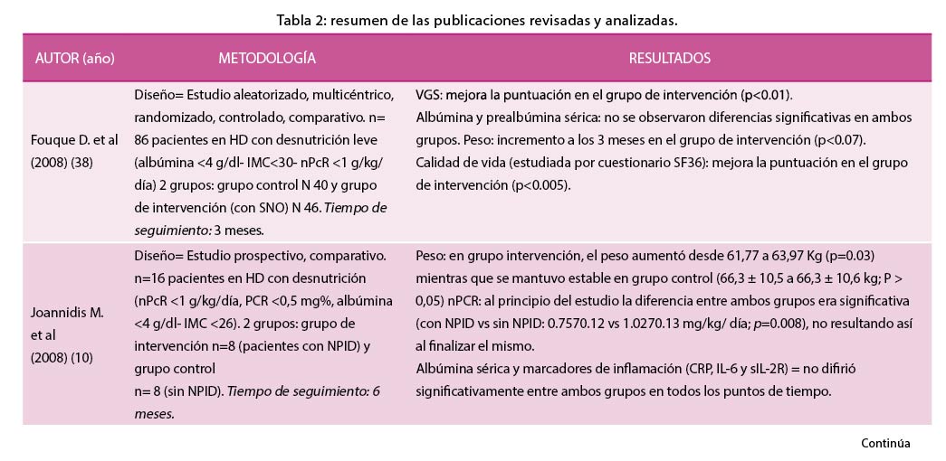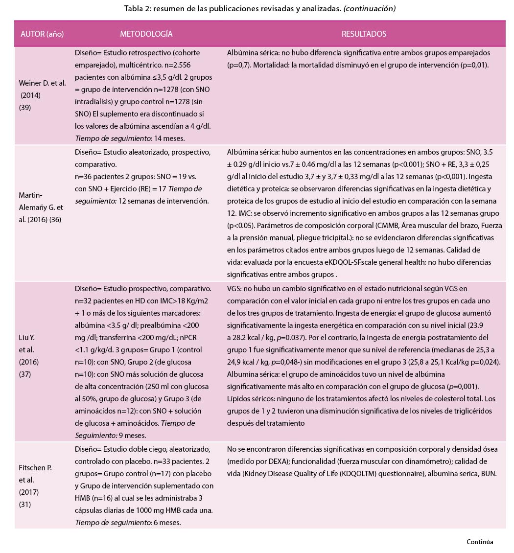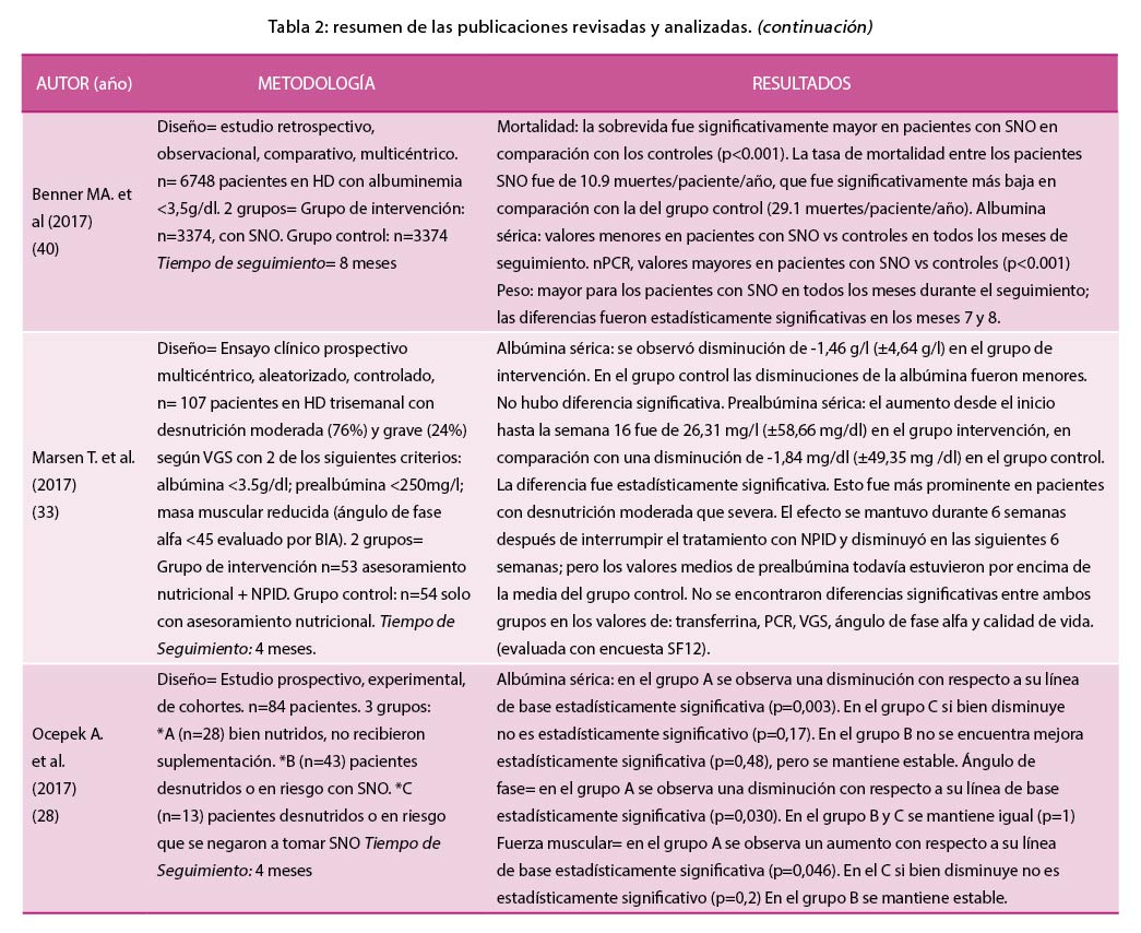 Según la evidencia presentada, se concluye que la implementación del SN tiene el potencial de mejorar el estado nutricional en pacientes en HD con desnutrición establecida y/o con riesgo de padecerla; si bien el impacto en los diferentes parámetros evaluados presenta controversia. Se destaca también, la importancia de una intervención nutricional oportuna y precoz como así también la realización del SNO durante la sesión de HD como estrategia para compensar la ingesta inadecuada de proteínas y energía.