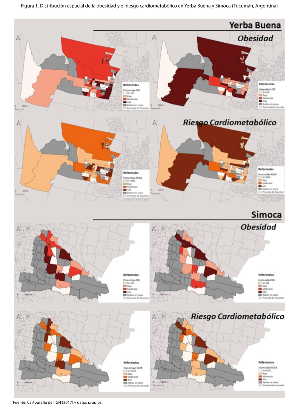 Por otra parte, si bien el desequilibrio energético que da lugar a la obesidad se expresa a nivel orgánico, en su manifestación han confluido aspectos ambientales, sociales, económicos, culturales y políticos que dan cuenta de procesos de territorialización subyacentes. La conformación del espacio geográfico determina condiciones de vida que, a su vez, promueven modos de vivir que pueden beneficiar o perjudicar la salud de las personas y sus comunidades (23). En este sentido, la vertiente ecológica del presente estudio implicó el desarrollo de indicadores de obesidad y riesgo cardiometabólico y su posterior espacialización, cristalizando una mirada de la salud que articula la nutrición y la geografía.