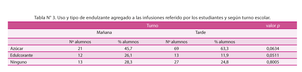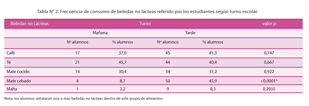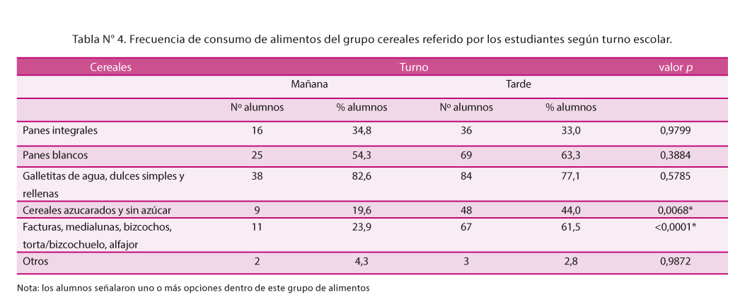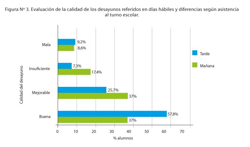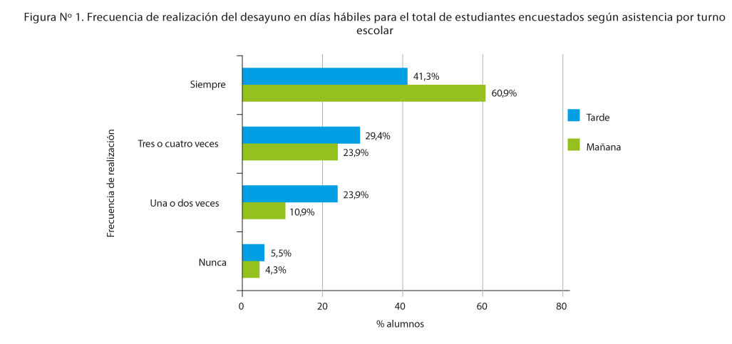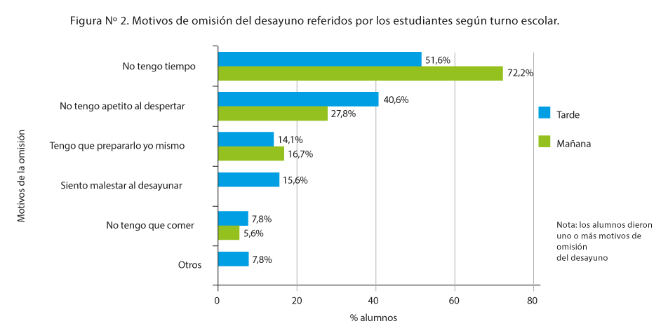Con respecto a las razones por las que los adolescentes evaluados no realizaban el desayuno, la más elegida fue “no tengo tiempo”. En el turno mañana, el 72,2% de los alumnos seleccionó esta categoría, siendo considerablemente menor el porcentaje de alumnos que lo hizo en el turno tarde. Muchos adolescentes mayores están ocupados hasta tarde en las noches haciendo las tareas escolares, actividades extracurriculares y trabajos de medio tiempo. Se acuestan tarde por lo que se levantan con poco tiempo para desayunar antes de ir a la escuela, con demasiada prisa para comer (27) siendo éstas quizás las causas de no tener tiempo para el desayuno. En segundo lugar, se destacó la categoría “no tengo apetito al despertar” siendo este resultado similar al encontrado en un estudio que se llevó a cabo en dos escuelas primarias de la ciudad de Santa Fe (28).