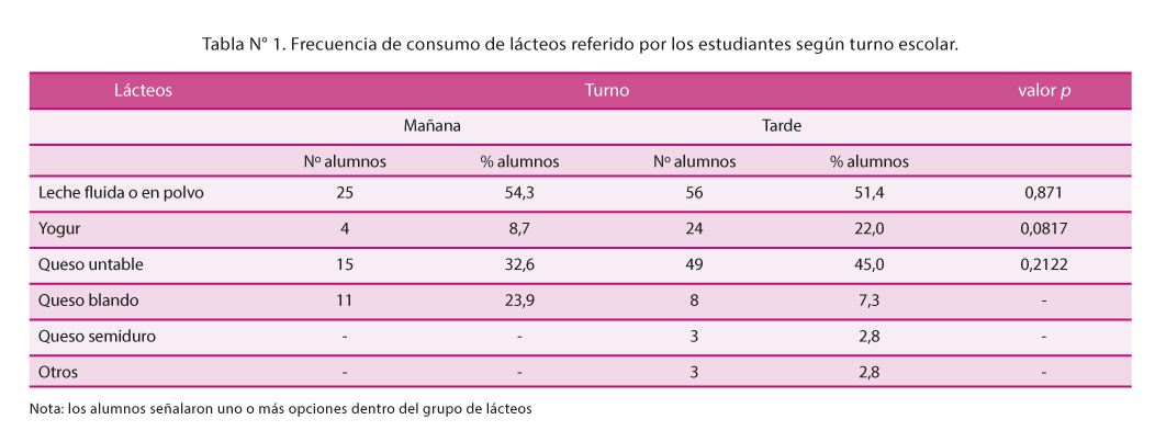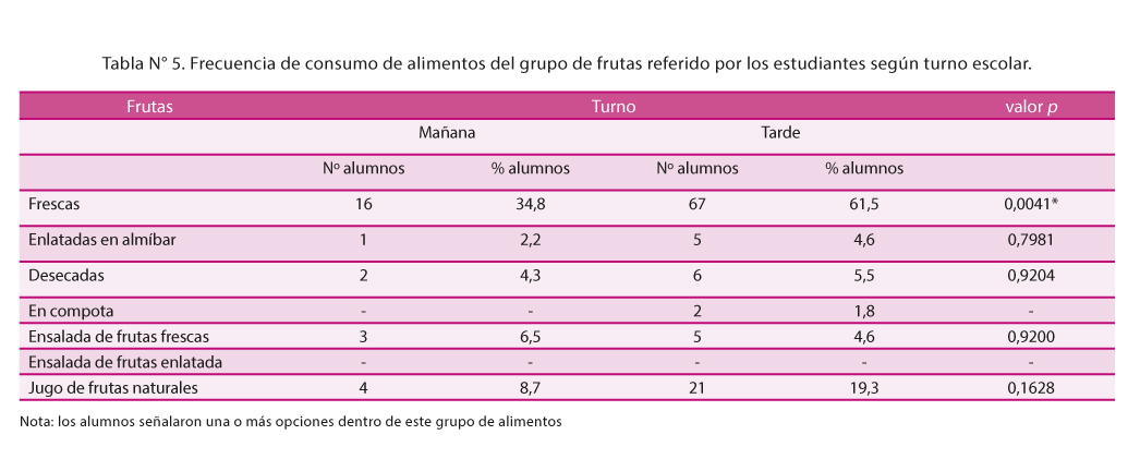 relación al horario escolar la preferencia hacia las frutas frescas es considerablemente mayor entre quienes asisten al turno tarde.