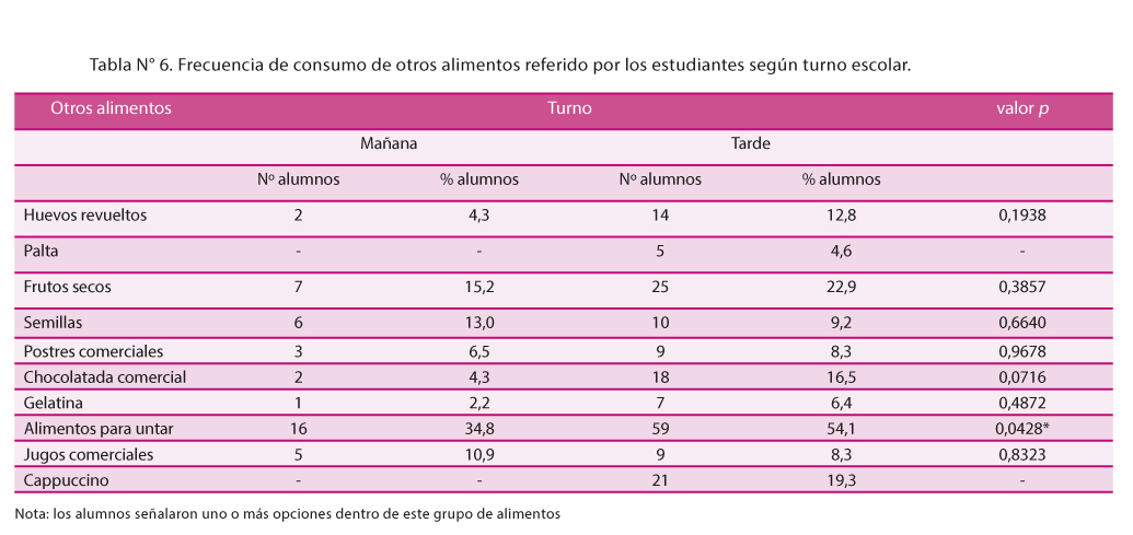 En último lugar, y por fuera de la triada que conforma un desayuno saludable, los alumnos mostraron incluir otros alimentos como manteca, mermelada, miel o dulce de leche. Estos productos elegidos conforman el grupo de alimentos de consumo opcional dentro de las GAPA. Los mismos son de gran aceptación por parte de la sociedad en su conjunto y están totalmente incorporados dentro de las elecciones de las personas (25).