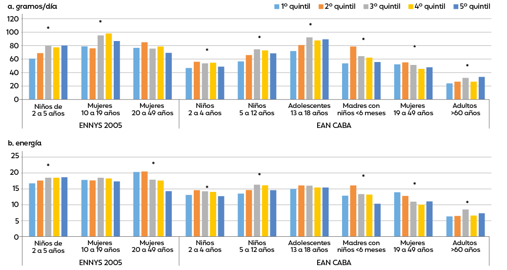 En los niños, niñas, mujeres adolescentes y mujeres en edad fértil de la Argentina, la ingesta promedio de azúcares agregados osciló entre 73,2 ±43,3 g/d y 88,2 ±57,8 g/d, lo que en promedio representa el 18% de la energía diaria aportada por éstos. Entre el 72% y el 84% de la población consumió más del 10% de la energía en forma de azúcares agregados (Tabla 2). El consumo de energía mostró una relación positiva con los ingresos del hogar en todos los grupos evaluados, es decir que a medida que crecían los ingresos aumentó el consumo. En los niños y niñas de 2 a 5 años se observó una tendencia creciente en la proporción de energía aportada de azúcares agregados a medida que aumentaba el nivel de ingresos (p<0,01), mientras que en las mujeres en edad fértil la tendencia fue inversa (p<0,01), con una ingesta del 20,3% de la energía en las mujeres del primer quintil de ingresos y 14,4% en las del último (Tabla 2, Figura 1B).
