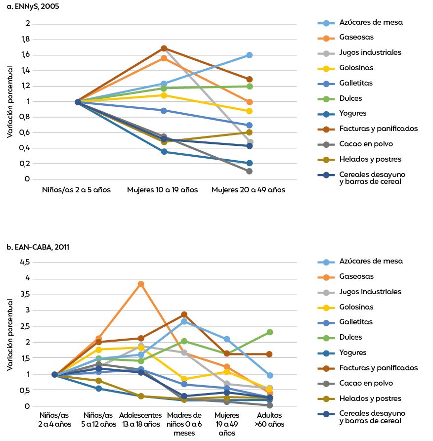 El aporte de las bebidas azucaradas (gaseosas y jugos) se incrementó desde la infancia hasta la adolescencia donde encontró el máximo consumo y luego descendió, al igual que las galletitas (Tabla 3, Figura 2). En la Ciudad de Buenos Aires, los niños y niñas escolares consumieron 1,8 veces más azúcar proveniente de gaseosas y jugos y los adolescentes 3,2 veces más que los niños de 2 a 4 años. Mientras que los adultos mayores de 60 años consumieron la mitad que los niños de 2 a 4 años y 7,5 veces menos que los adolescentes. En tanto que, para el azúcar de mesa el consumo de los escolares y adolescentes fue 1,5 veces mayor y el de las mujeres adultas fue 2,4 veces mayor que el de los preescolares (Tabla 3, Figura 2).
