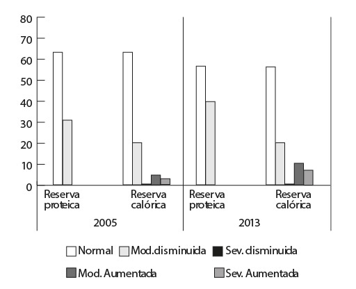 Conclusiones. Los resultados demuestran que el estado de las reservas calórico-proteicas de los estudiantes de la carrera de Lic. en Nutrición no presentaron diferencias significativas entre el corte 2005 y 2013.