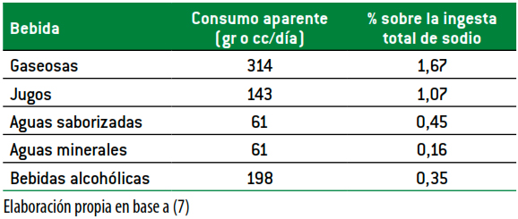 Según la HCA 2011, el consumo (disponible) de sodio proveniente de alimentos y bebidas es de 2,6 gr, claramente por encima de la recomendación. De este conjunto, solo 3,7% corresponden a aguas y bebidas (12).