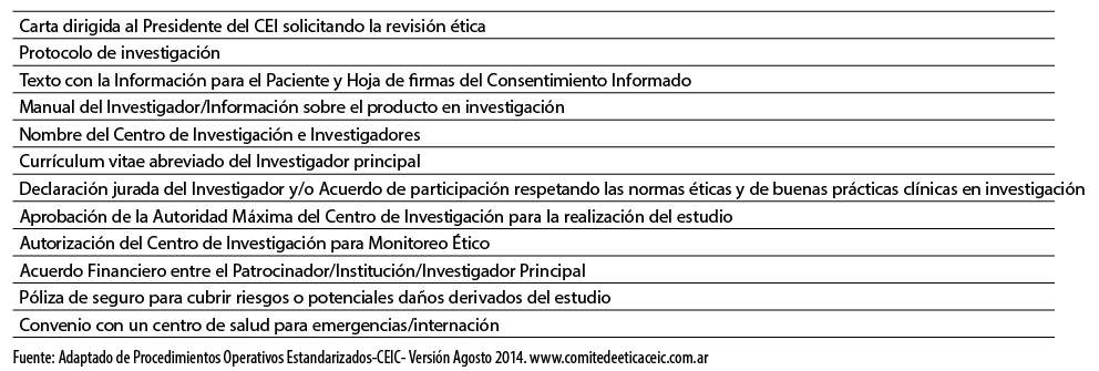 La documentación que requieren los Comités, en términos generales, para la revisión ética de un estudio de investigación se detalla en la tabla 1. Los requerimientos varían de acuerdo al tipo de estudio.
