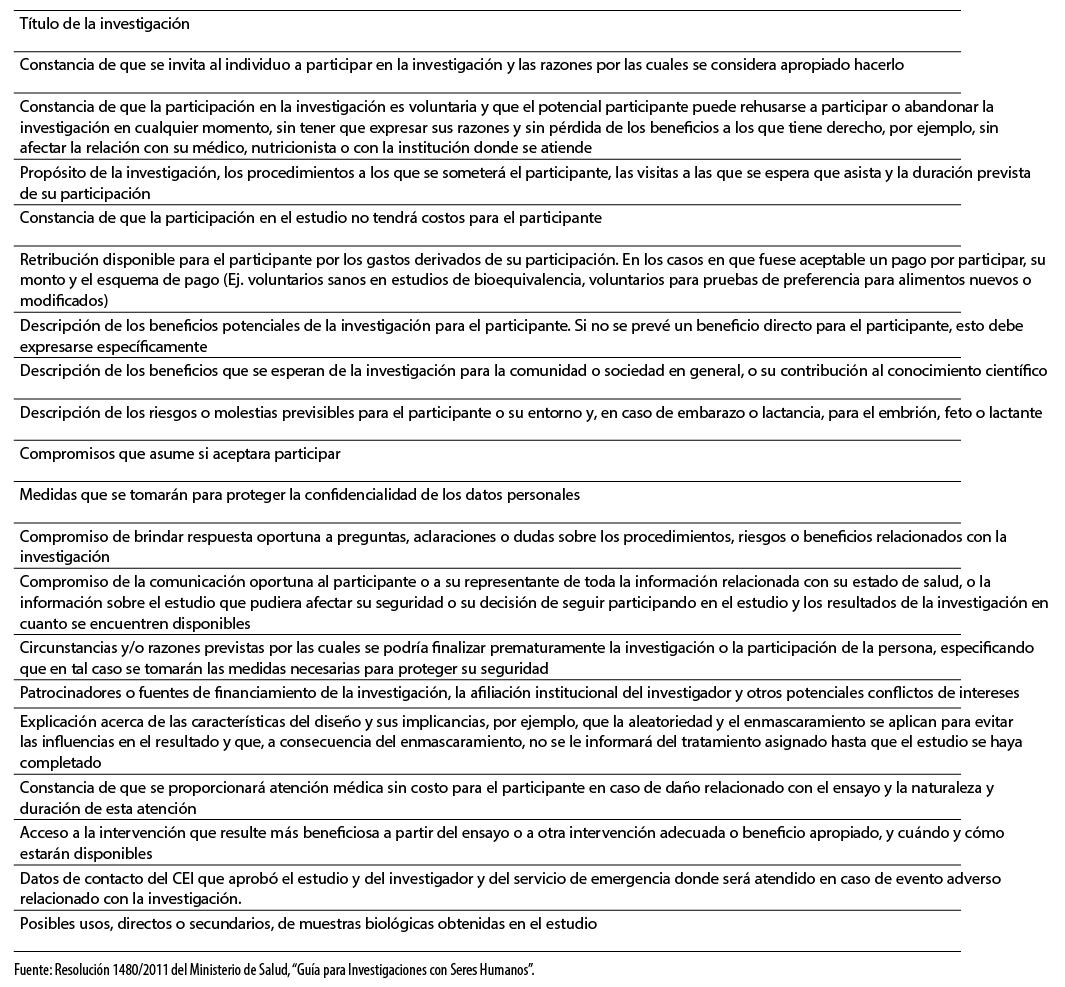 El CEI debe asegurarse que los potenciales participantes darán su consentimiento libre de coerción e incentivo indebido y lo hará luego de recibir toda la información de manera adecuada. Es un requisito ineludible que aquellas personas que se involucren en un estudio lo hagan bajo su propia voluntad. Para garantizar el cumplimiento de este requisito, se adoptó el mecanismo de consentimiento informado. Como lo describe la disposición 6677/10 de la Administración Nacional de Medicamentos, Alimentos y Tecnología Médica (ANMAT), este proceso permite asegurar que un individuo tome de manera voluntaria, libre de incentivos indebidos y de coerción, la decisión de participar en una investigación en salud humana, siempre que ésta sea consistente con sus valores, intereses y preferencias. Así, se asegura el cumplimiento del principio ético de autonomía, que exige el respeto a la capacidad de decisión de las personas, y el derecho a que se respete su voluntad en aquellas cuestiones que se refieren a ellas mismas. El artículo 59 del Código Civil y Comercial de la Nación destaca las consideraciones relacionadas con el consentimiento informado para actos médicos e investigaciones en salud. En la tabla 2, se describen los elementos esenciales de la hoja de información para el paciente.