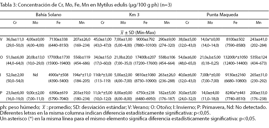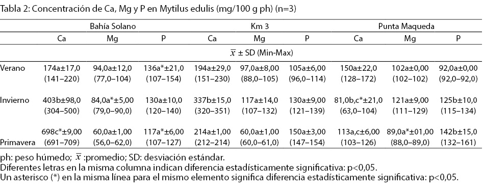 Los mejillones aportarían una gran cantidad de elementos indispensables, con una variación temporal y geográfica que debería ser considerada al compilar los datos de composición de alimentos. Su elevado contenido en minerales antioxidantes motiva profundizar en el estudio de los efectos de la ingesta de esta especie.