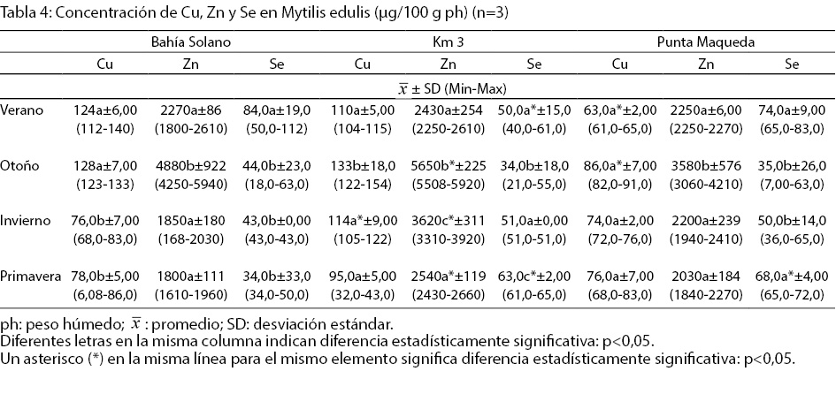 Cobre y zinc son elementos esenciales, pero el exceso puede ser peligroso para la salud humana. Por ello, la FAO/WHO determina una Ingesta Semanal Tolerable Provisional (ISTP) en mg/kg/semana para el Cu de 3,5 mg/kg/semana (equivalente a 210 mg por semana para una persona de 60 kg), y para el Zn de 7 mg/kg/semana (equivalente a 420 mg) (26, 27). En tal sentido, el consumo de 100 g de los mejillones de esta zona, son seguros.
