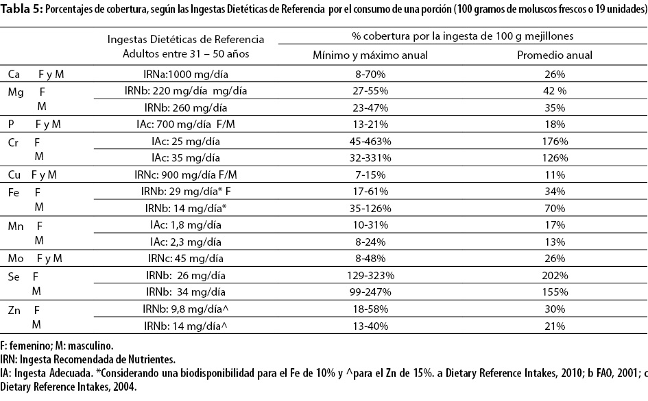 Los porcentajes de valores diarios (%VD) con base a una dieta de 2000 kcal son: Ca 263 mg (26% VD); Mg 91,6 mg (35% VD); P 125 mg (18% VD); Cr 44,1 µg (126% VD); Cu 96,4 µg (11% VD); Fe 9,80 mg (70 % VD); Mn 0,30 mg (13% VD); Mo 11,9 µg (26 % VD); Se 52,6 µg(155% VD); Zn 2,92 mg (42% VD). Estos valores fueron calculados considerando las IDR de los minerales de declaración voluntaria de acuerdo a la legislación argentina (28) para una porción de 100 g de mejillones (aproximadamente 19 unidades).