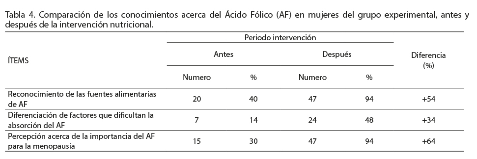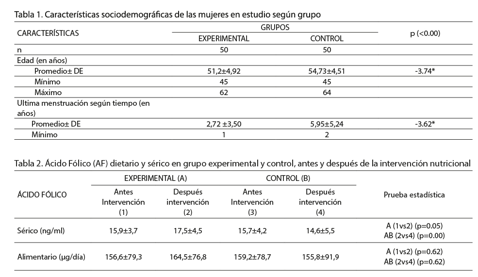 Respecto a este nutriente, investigaciones poblacionales han señalado que las mujeres pre y post menopáusicas, son un grupo vulnerable a la deficiencia de ácido fólico debido a la baja ingesta de sus principales fuentes alimentarias entre ellas, hortalizas de hoja verde, espárragos, zumo de naranja, maníes y legumbres, entre otros; parcialmente incluidos dentro de sus hábitos alimentarios (8). Adicionalmente, en estas mujeres aumenta el riesgo de padecer enfermedades crónicas degenerativas: cardiovasculares, cáncer de mama y enfermedades neurodegenerativas, entre otras; sobre las cuales el ácido fólico parece estar involucrado en su prevención y control, al actuar en los procesos metabólicos a nivel de los diferentes sistemas y además, en la multiplicación celular (9). Bajo estas consideraciones, esta investigación resulta pertinente, ya que permitirá determinar la variación en los niveles séricos y consumo alimentario del ácido fólico en mujeres climatéricas tras realizar una intervención nutricional de tipo educativa.