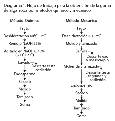 En el Método Mecánico en seco (MM) (5), los frutos seleccionados y secos se molieron y tamizaron separando el exo y mesocarpio de la semilla, estas se secaron en estufa durante 16 horas, luego se molieron y tamizaron, separando la testa, tegumen y cotiledón del endosperma, el cual fue molido en molino eléctrico hasta obtener la goma que fue tamizada en malla N°60 de 250 micrones.