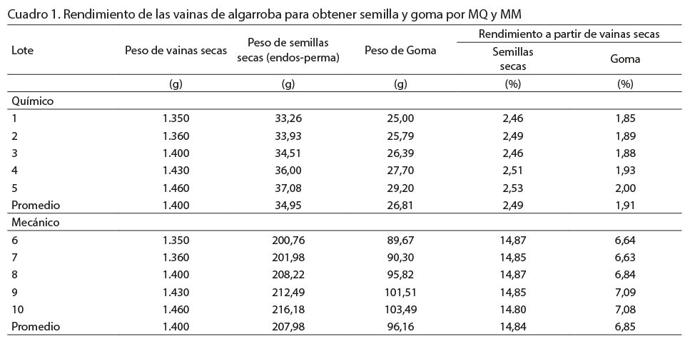 Los rendimientos de semilla y goma a partir de las vainas por MQ (2,40 y 1,91%) fueron inferiores al MM (14,84 y 6,85%, respectivamente).