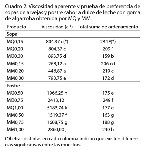 El polvo para preparar 100 g de sopa deshidratada se formuló con harina de trigo (34; 33,25 y 31,75 g% variando según concentración de goma), harina de arvejas (45 g%), leche en polvo (10g%), aceite (5g%), extracto de carne (1,2 g%), cebolla deshidratada (0,5 g%), pimiento deshidratado (0,5 g%), ajo en polvo (0,25 g%), cloruro de sodio (1g%), glutamato monosódico (0,3 g%) y goma de algarroba a distintas concentraciones (2,25; 3 y 4,5 g%). Para obtener el producto listo para el consumo, se rehidrató 16,75g de polvo en 250cc de agua y se trató térmicamente durante 10 minutos, obteniéndose una proporción de goma en el producto final de 0,15; 0,20 y 0,30%, denominándose a las mismas según concentración y método de obtención como: MQ0,15; MQ0,20; MQ0,30 y MM0,15; MM0,20; MM0,30.