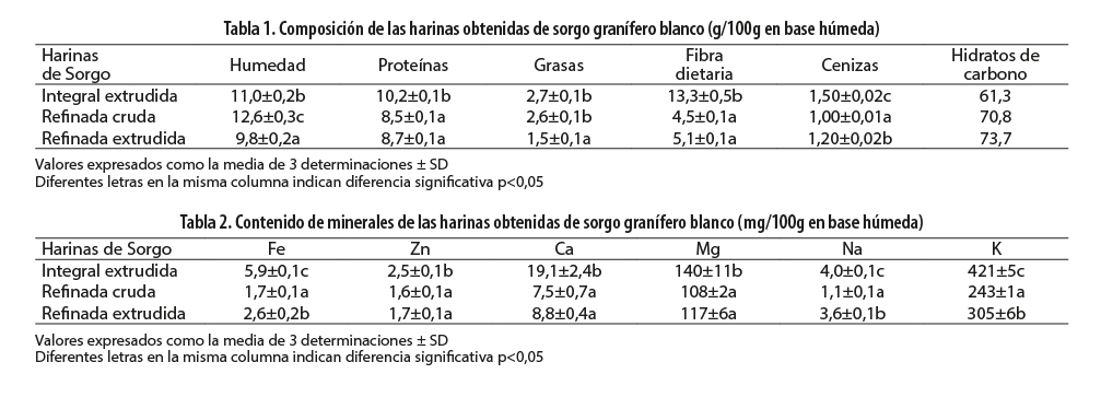 En el presente trabajo se estudiaron las características nutricionales de harina integral y refinada de sorgo granífero blanco, con o sin extrusión, utilizadas en el país para la elaboración de productos de consumo general y libres de gluten. Se estudió el contenido de proteínas, grasas, fibra dietaria y minerales de interés nutricional: hierro (Fe), zinc (Zn), calcio (Ca), magnesio (Mg), sodio (Na) y potasio (K).