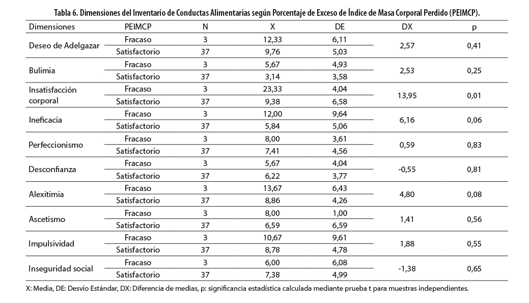 Resulta importante destacar que, si bien los indicadores antropométricos analizados indicarían una intervención exitosa, un importante porcentaje manifestó temor a ser gordos, conductas bulímicas, insatisfacción corporal, ineficacia, perfeccionismo, imposibilidad para diferenciar sentimientos de sensaciones corporales, tendencias a comportamientos virtuosos e impulsividad. Este hallazgo resulta relevante dado que estas dimensiones se han asociado, en otros trabajos, a una probabilidad de trastorno de la conducta alimentaria (6, 29, 30). Otros autores han descripto la importancia de la salud mental en el éxito del tratamiento (31, 32).