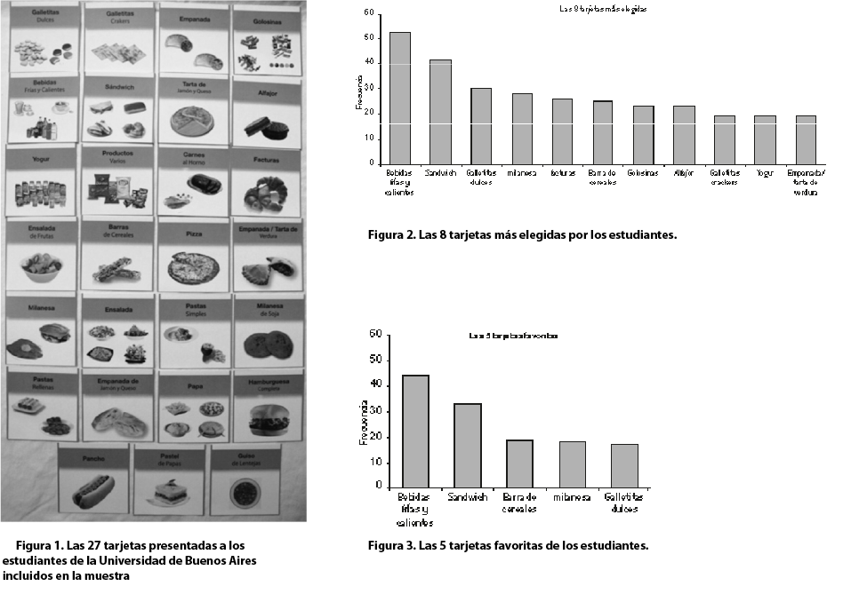 Las 5 tarjetas favoritas de los estudiantes fueron: Bebidas frías y calientes, Sándwich, Barra de Cereales, Milanesas y Galletitas dulces. Se utilizarán estos resultados para diseñar una investigación cuantitativa que permita corroborar patrones de consumo y ofrecer alternativas alimentarias para las cantinas universitarias que contribuyan al cuidado de la salud de los estudiantes.